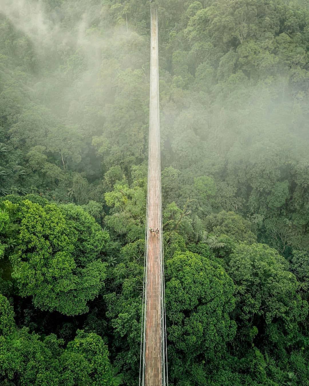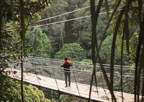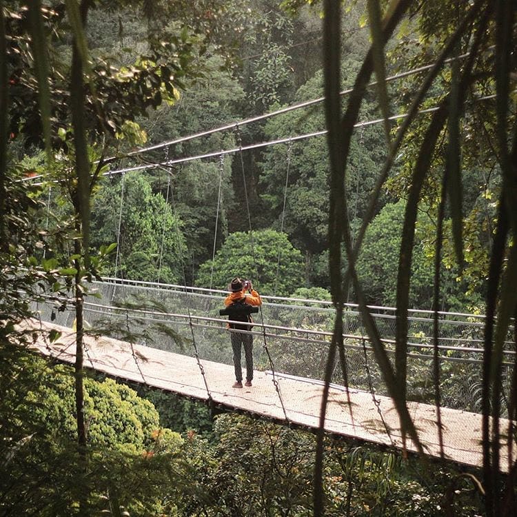 Dari atas jembatan gantung ini, kamu bisa menikmati hutan damar di Taman Nasional Gunung Gede Pangrango dari ketinggian. Hembusan angin, udara yang segar dan goyangan jembatan gantung menambah sensasi asyik, dan juga sedikit ngeri.